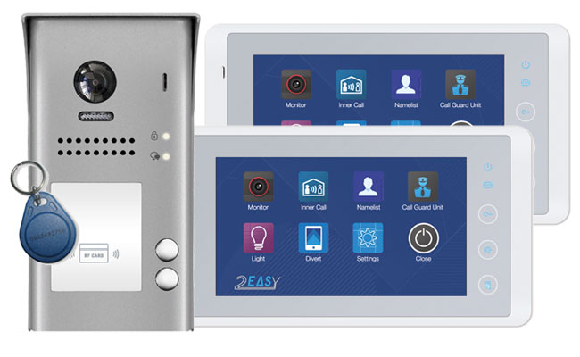2-Button Steel Door Station Proximity Reader, so that residents can open the door lock with keyfobs. Inside the apartments, residents will have Cronus White 7-inch touch screen monitor
