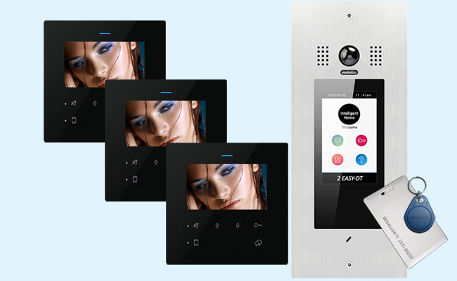 Victor DT821T5 door station with 5-inch TFT screen incorporates Keyfob Reader and Digital Keypad so that residents can open the door lock either with keyfob or with an unlocking code from the outside. Each resident can have a unique unlocking code - useful if apartments are rented out. Codes can be changed when tenants leave. Codes can also be assigned to postmen, gardeners or delivery personnel as required. It has information page for first time visitors telling them how to contact an apartment. Doorbell voice function tells visitors if the door is open, or a resident is unavailable- very useful for visually impaired people. Inside the apartments, residents will have an DF4 4-inch monitor in acrylic glass piano black finish