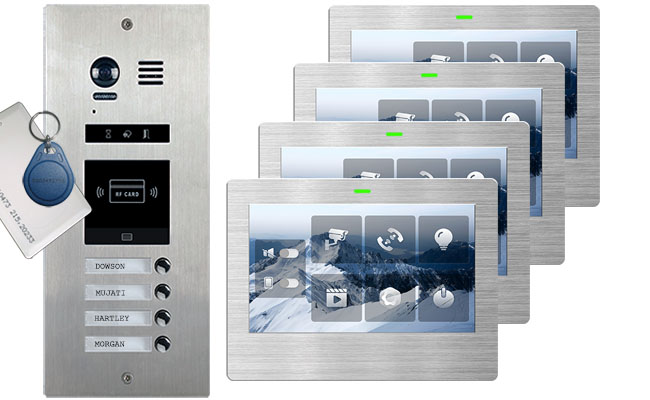 VOSPER door station with built-in proximity reader so that residents can open the door lock with an RFID fob or card from the outside. It has 3-inch TFT screen with scrolling information for first time visitors telling them how to contact an apartment. Doorbell voice function tells visitors if the door is open, or a resident is unavailable- very useful for visually impaired people. This door station is direct call meaning each apartment called by specifically assigned button. Inside the apartments, residents will have 7-inch touch screen monitors in brushed aluminium finish