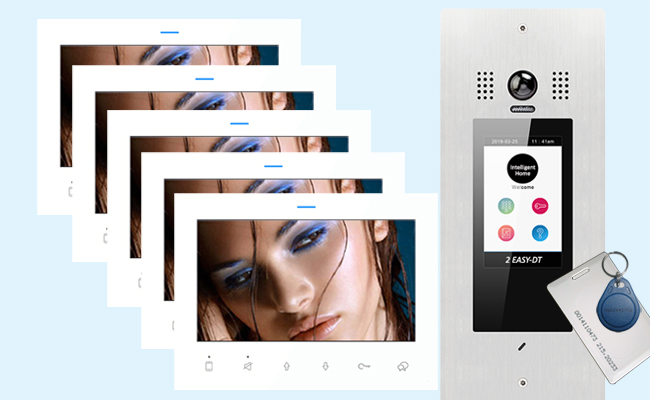 Victor DT821T5 door station with 5-inch TFT screen incorporates Keyfob Reader and Digital Keypad so that residents can open the door lock either with keyfob or with an unlocking code from the outside. Each resident can have a unique unlocking code - useful if apartments are rented out. Codes can be changed when tenants leave. Codes can also be assigned to postmen, gardeners or delivery personnel as required. It has information page for first time visitors telling them how to contact an apartment. Doorbell voice function tells visitors if the door is open, or a resident is unavailable- very useful for visually impaired people. Inside the apartments, residents will have an DF7 7-inch monitor in acrylic glass ice white finish