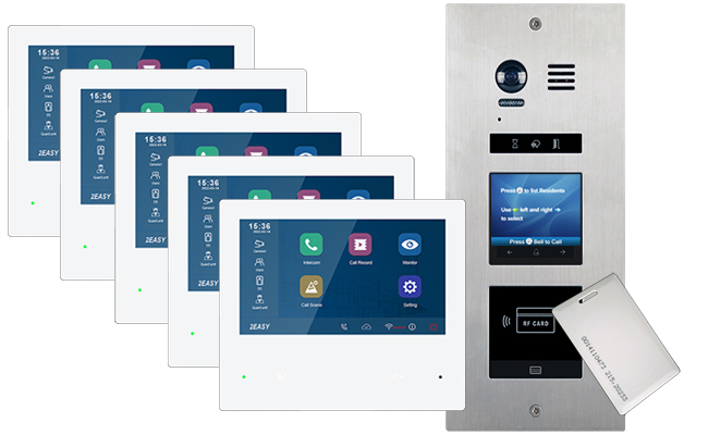 VOSPER door station with built-in proximity reader so that residents can open the door lock with an RFID fob or card from the outside. It has 3-inch TFT screen with scrolling information for first time visitors telling them how to contact an apartment. Doorbell voice function tells visitors if the door is open, or a resident is unavailable- very useful for visually impaired people. Inside the apartments, residents will have a WiFi/IP 7-inch touch screen image recording monitor with a function to divert video and audio call to a smartphone with App. WiFi/IP monitors connects to the Interned via WiFi