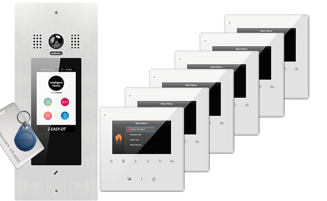 Victor DT821T5 door station with 5-inch TFT screen incorporates Keyfob Reader and Digital Keypad so that residents can open the door lock either with keyfob or with an unlocking code from the outside. Each resident can have a unique unlocking code - useful if apartments are rented out. Codes can be changed when tenants leave. Codes can also be assigned to postmen, gardeners or delivery personnel as required. It has information page for first time visitors telling them how to contact an apartment. Doorbell voice function tells visitors if the door is open, or a resident is unavailable- very useful for visually impaired people. Inside the apartments, residents will have an Avro 4.3-inch monitor in acrylic glass ice white finish