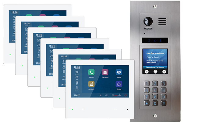 Vulcan DT821T/KP door station with built-in keypad so that residents can open the door lock with an unlocking code from the outside. Each resident can have a unique unlocking code - useful if apartments are rented out. Codes can be changed when tenants leave. Codes can also be assigned to postmen, gardeners or delivery personnel as required. It has 3-inch TFT screen with scrolling information for first time visitors. Doorbell voice function tells visitors if the door is open, or a resident is unavailable- very useful for visually impaired people. Scrolling info on the screen can be amended via SD card. Inside the apartments, residents will have a WiFi/IP Monitor which connects to the Internet via WiFi. Divert video and audio calls to a smartphone. Five people can get diverts using the free App. Remote unlocking too. Never miss your visitors!
