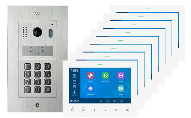 DH821KP door station Full Colour Night Vision with mechanical keypad. Doorbell voice function tells visitors if the door is open, or a resident is unavailable- very useful for visually impaired people.Inside the apartments, residents will have a WiFi/IP 7-inch touch screen image recording monitor with a function to divert video and audio call to a smartphone with App installed. WiFi/IP monitors connects to the Interned via WiFi