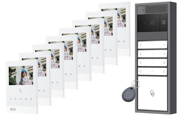 Valiant door station with built-in proximity reader so that residents can open the door lock with an RFID fob. Doorbell voice function tells visitors if the door is open, or a resident is unavailable- very useful for visually impaired people. This door station is Direct Call meaning each apartment is called by designated button. Inside the apartments, residents will have a WiFi/IP 5-inch touch screen image recording monitor with a function to divert video and audio call to a smartphone with App installed. WiFi/IP monitors connects to the Interned via WiFi