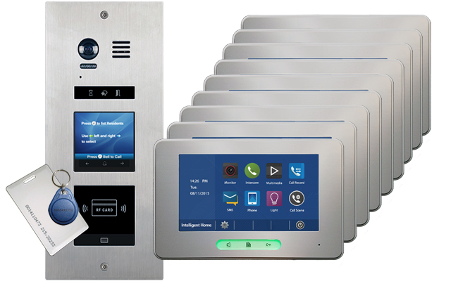 VOSPER door station with built-in proximity reader so that residents can open the door lock with an RFID fob or card from the outside. It has 3-inch TFT screen with scrolling information for first time visitors telling them how to contact an apartment. Doorbell voice function tells visitors if the door is open, or a resident is unavailable- very useful for visually impaired people. Inside the apartments, residents will have Alecto 7-inch touch screen Image Recording monitor