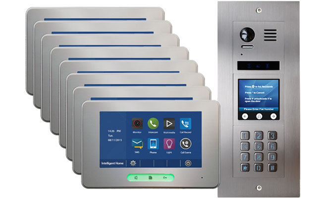 Vulcan DT821T/KP door station with built-in keypad so that residents can open the door lock with an unlocking code from the outside. Each resident can have a unique unlocking code - useful if apartments are rented out. Codes can be changed when tenants leave. Codes can also be assigned to postmen, gardeners or delivery personnel as required. It has 3-inch TFT screen with scrolling information for first time visitors. Doorbell voice function tells visitors if the door is open, or a resident is unavailable- very useful for visually impaired people. Scrolling info on the screen can be amended via SD card. Inside the apartments, residents will have an Alecto 7-inch Touch screen Image Recording Monitor
